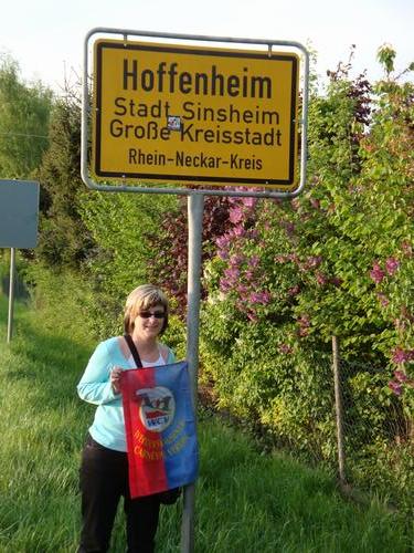 Antje Schwenke vor dem Ortsschild des Fußball Bundesligisten Hoffenheim