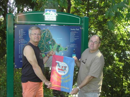 Unser Fahne vor einem Schild des Stanley Parks in Vancouver