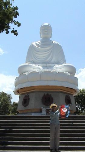 Susen Baier mit Fahne in der Stadt Nha Trang vor einer Budda Statue